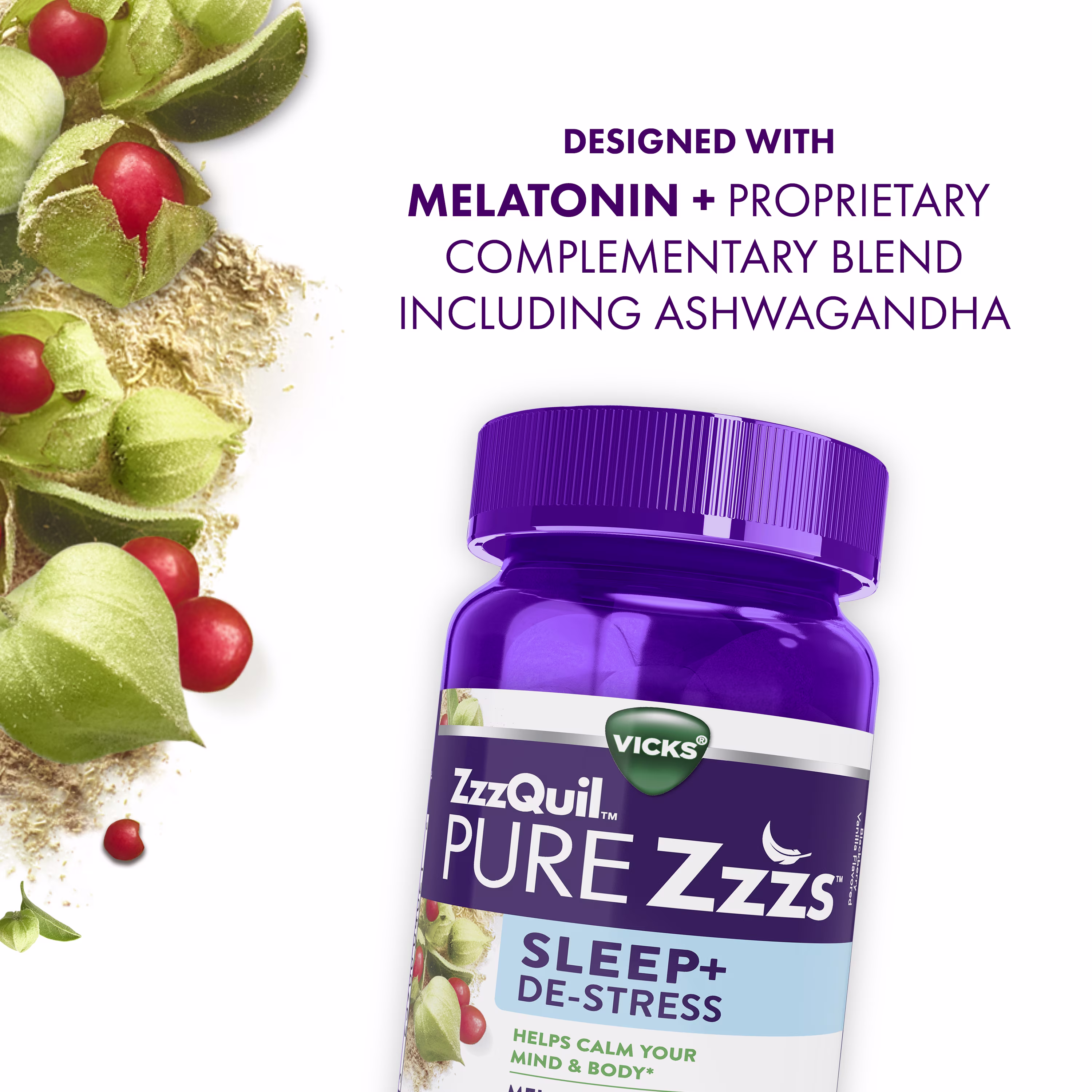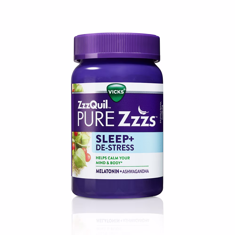 When life keeps you up at night, try ZzzQuil PURE Zzzs Sleep+ De-Stress Gummies. Our drug-free melatonin formula includes Ashwagandha to help calm your mind and body* before bed.