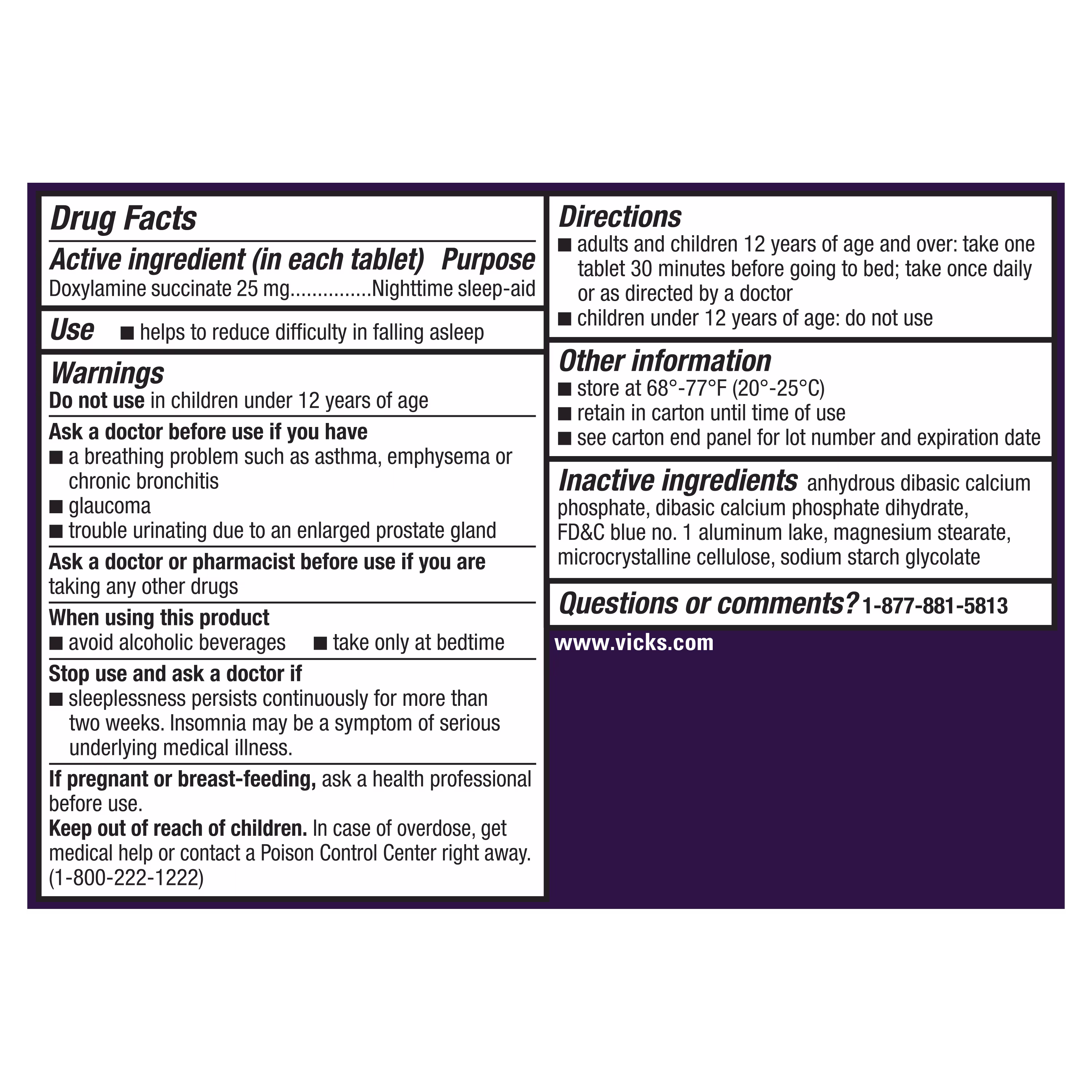 In each tablet: Doxylamine succinate 25 mg (Nighttime sleep-aid)